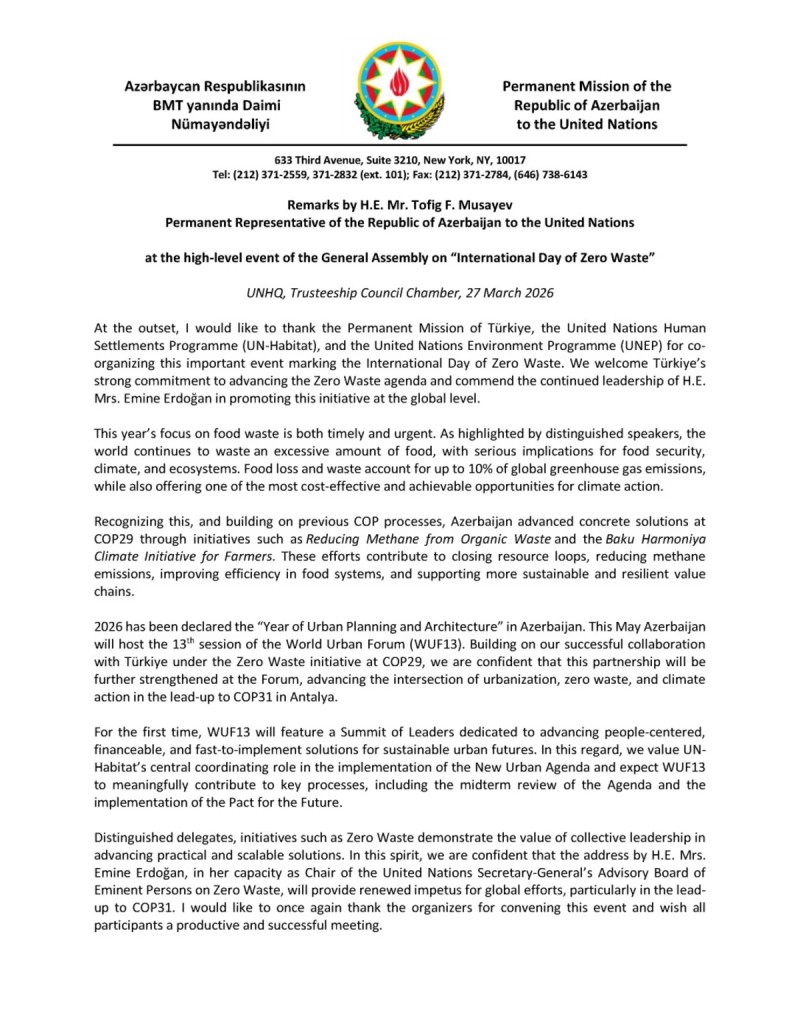 "Azərbaycan iqlim, ekosistemlər və ərzaq təhlükəsizliyi üçün ciddi fəsadları olan bir məsələ kimi qida tullantıları ilə mübarizənin təcili ehtiyac olduğunu vurğulamaq məqsədilə BMT Baş Assambleyasının (UNGA) yüksək səviyyəli tədbirinə qoşulub", - məlumatda bildirilib.
